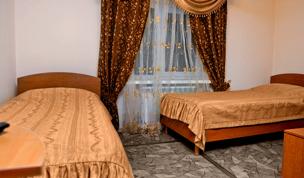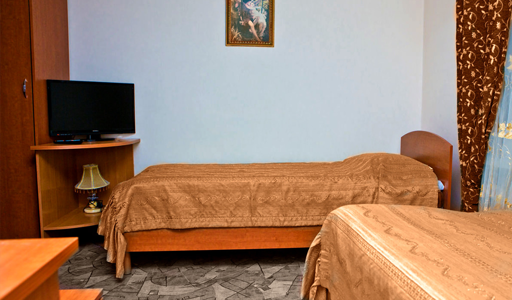 Площадь номера - 15 кв.м. 2 осн. места. 1 доп. место. Мебель: вешалка, зеркало, ковровое покрытие, кровати односпальные, прикроватные тумбочки, шкаф. Оборудование: мини-холодильник, телевизор, чайный набор посуды. Санузел: с душем, туалетные принадлежности, фен. Сервис: Wi-Fi бесплатно, смена полотенец, смена постельного белья, уборка номера.